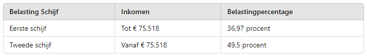 Elke box heeft verschillende belastingtarieven. Voor box 1 geldt: hoe hoger uw inkomen, hoe meer belasting en sociale bijdragen u moet betalen. De belasting die u betaalt, wordt berekend op basis van een percentage van uw inkomen, vaak aangeduid als belastingschijven.