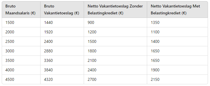 Opmerking: De tabel gaat ervan uit dat uw bruto maandsalaris gedurende het jaar consistent is. Als u in sommige maanden minder verdient, kan uw netto vakantietoeslag lager uitvallen.